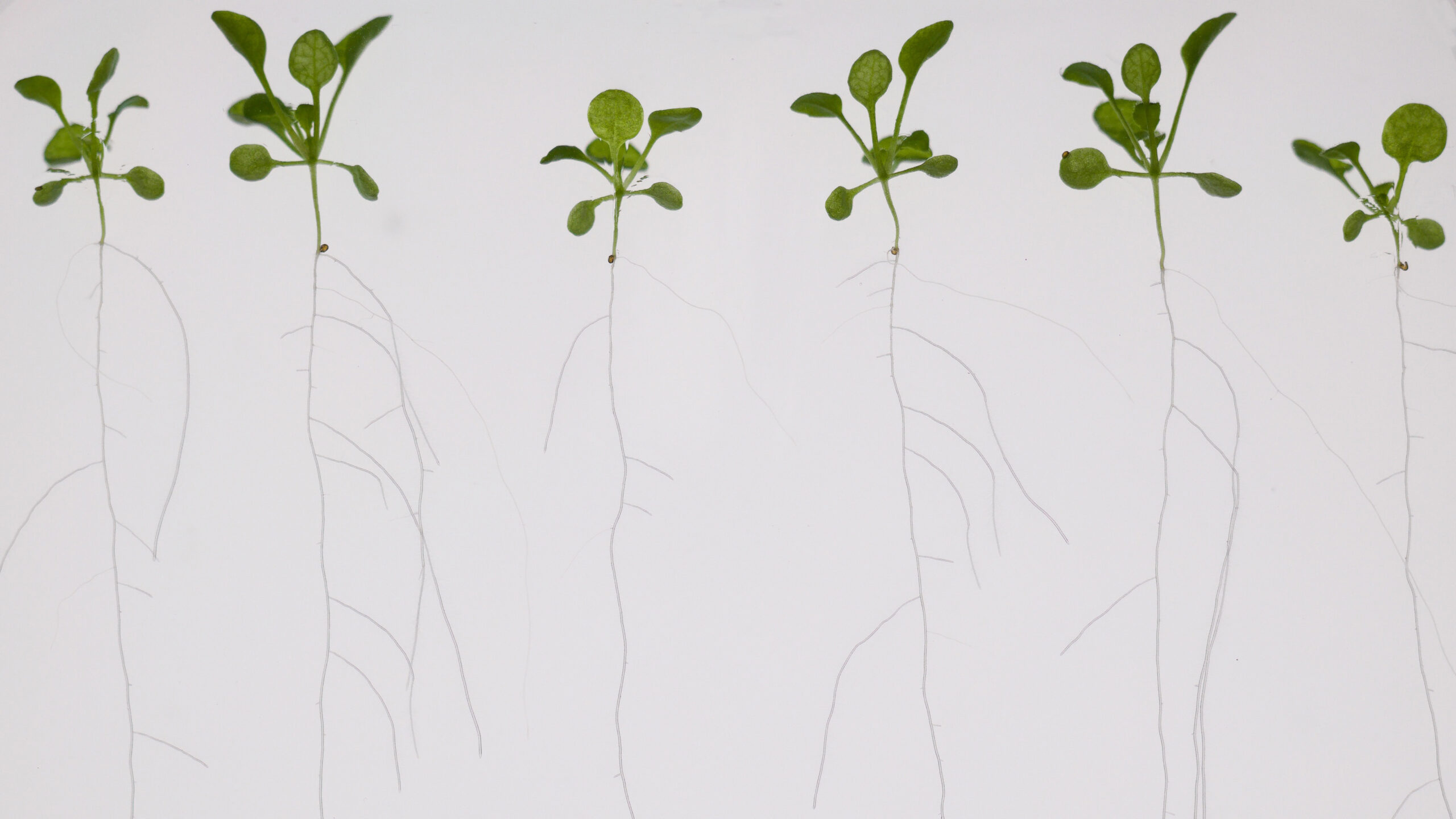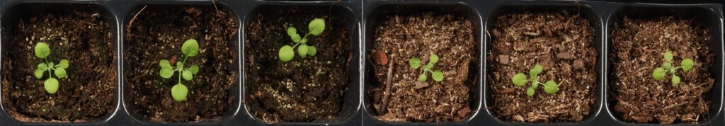 Stress matrix experiments with thale cress seedlings. The left 3 seedlings are grown in a well-watered soil and the right in a dry soil.