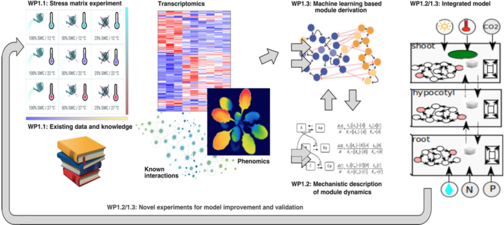 The research focuses on the responses of thale cress or Arabidopsis thaliana seedlings to combined and isolated exposure to drought and elevated temperature. To obtain insights, the team collects (multi-omic) data from stress matrix experiments. Furthermore, it develops models that can reproduce and predict seedling responses to temperature and drought stress. The team develops both machine learning models and mechanistic models. These models are integrated into each other and validated in an experimental way by an iterative modelling-experimentation cycle.