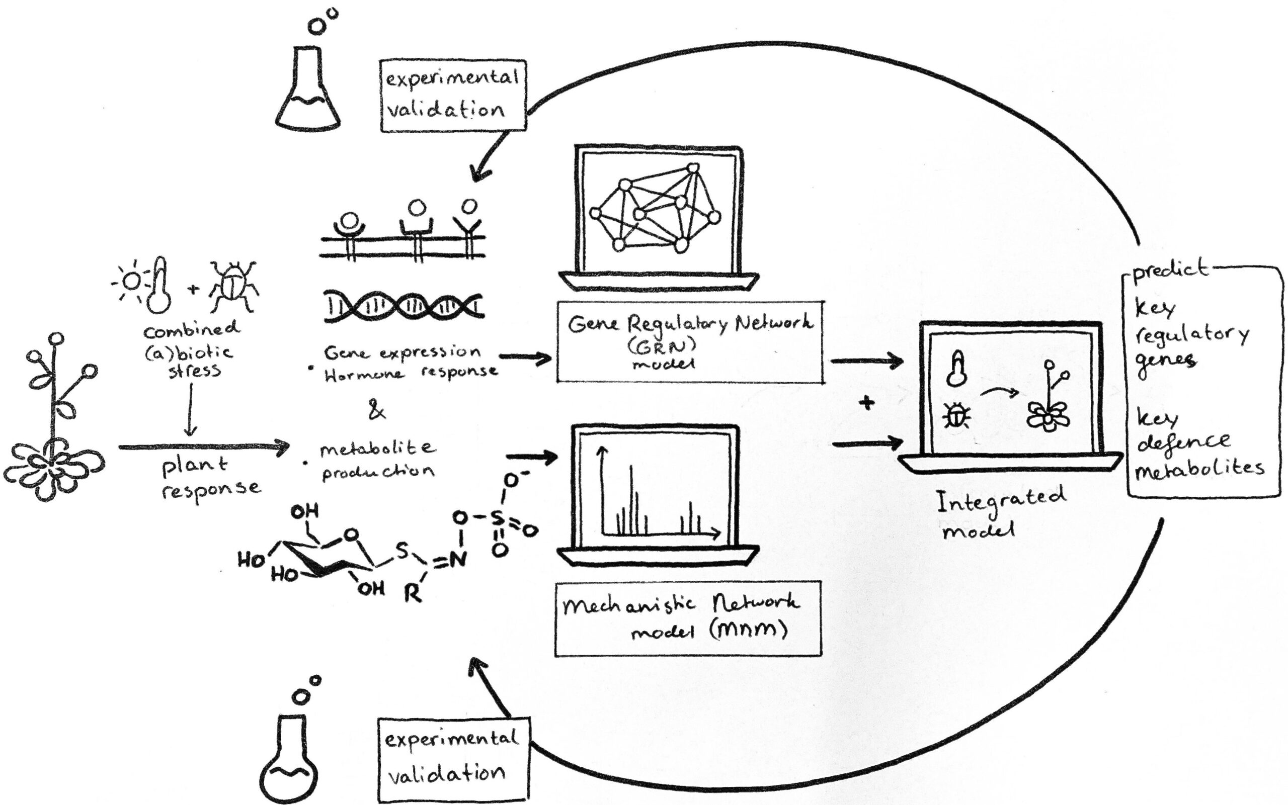 The team analyses how the model plant Arabidopsis thaliana (thale cress) defends itself when it is exposed to one or a combination of stresses, including elevated temperature. Furthermore, it examines what external stress means for the defense metabolite production of the plant. The team develops a Gene Regulatory Networks Model (GRN) using ‘deep learning’, a machine learning technique. The model should predict which genes are triggered and expressed when a plant is exposed to multiple stresses. Next, the team connects this model to a Metabolic Network Model (MNM). This is a model that reflects the metabolite production of a plant when it is exposed to temperature extremes and pathogen (diseases) attacks. It then integrates the various models into one model.
