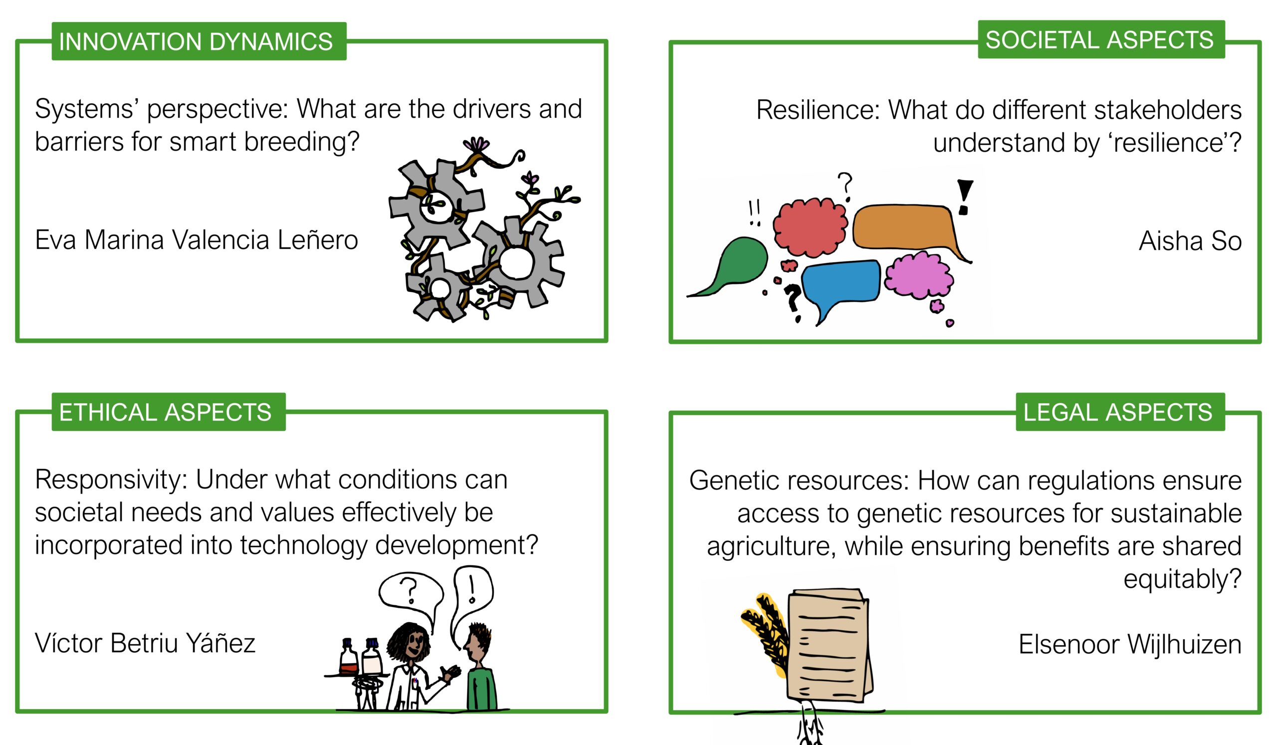 This team examines the smart data breeding methodology through the lens of the social sciences and humanities. The team studies the ethical, legal and societal aspects of smart breeding alongside investigating the wider socio-technical system. There are many pivotal questions. Which elements of the socio-technical system enable and constrain smart breeding? How do stakeholders understand resilience in different ways? What implications does this have for developing the smart breeding concept? How can the development of smart breeding incorporate societal needs and concerns in a meaningful way? How can the access to plant genetic resources be regulated in a fair and equitable way in the context of smart breeding? The team encompasses a wide range of studies which cross-pollinate each other, enhancing their strength. The team also actively contributes to the studies of other teams within CropXR.